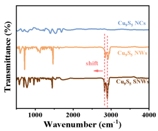En el espectro FT-IR de Cu9S5 SNW como se muestra en la Figura 3, se observó un fenómeno de desplazamiento al rojo significativo en comparación con los Cu9S5 NW, lo que indica la interacción electrónica entre Cu y S. Los picos característicos de las muestras de Cu9S5 NW y Cu9S5 SNW a 2916 cm-1 y 2846 cm-1 se pueden atribuir al modo de vibración de estiramiento del metileno (-CH2-) en dodecanotiol, mientras que el pico característico a 1471 cm-1 corresponde al modo de vibración de flexión del enlace C-H.