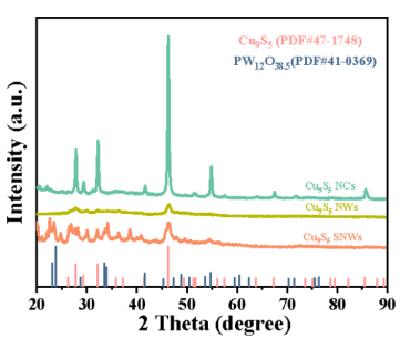 El ancho de medio pico del plano cristalino de Cu9S5 SNW (001) es significativamente mayor que el de las otras dos formas de muestras. Según la fórmula de Scherrer, cuanto menor es el tamaño del grano, mayor es la anchura del medio pico del pico de difracción correspondiente. Por el contrario, cuanto mayor sea el tamaño de partícula, más nítida será la mitad del ancho del pico de difracción. Debido al tamaño de escala subnanómetro (0,95 nm) de la muestra de SNW de Cu9S5 y al hecho de que la muestra exhibe una estructura unicelular sin un plano cristalino completo, el ancho del medio pico es significativamente mayor, mientras que el ancho del medio pico (001) de los SNW de Cu9S5 es mayor.