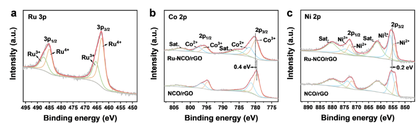 La tecnología XPS puede analizar en profundidad la composición elemental, los estados químicos y la estructura electrónica de las superficies del catalizador. Cuando la superficie del catalizador se irradia con rayos X, se excitan los electrones de los átomos de la superficie. Al detectar la energía y la cantidad de estos fotoelectrones, podemos determinar el tipo y contenido del elemento, así como el entorno químico en el que se encuentra el elemento. Por ejemplo, al estudiar catalizadores metálicos soportados, XPS puede determinar con precisión la forma del metal en la superficie del soporte, ya sea un elemento metálico o un óxido metálico, y los cambios en su estado de oxidación. Esto es muy importante para comprender la actividad y el mecanismo de desactivación del catalizador. Como se muestra en la Figura 5, se utilizó XPS para demostrar la composición y los estados de valencia de los elementos Ru, Co y Ni. Los espectros finos XPS de elementos específicos de la muestra se utilizaron para determinar el cambio positivo/negativo de la energía de enlace, lo que indica la existencia de interacciones electrónicas.