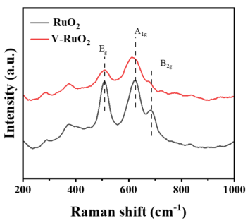 Como se muestra en la Figura 4, el espectro Raman de V-RuO2 (RuO2 dopado con V) es consistente con el de RuO2, sin otros picos únicos, excluyendo la generación de V2O5. El dopaje con V cambia el modo A1g del RuO2 a números de onda más bajos, lo que indica que la introducción de V afecta significativamente su estructura reticular y su entorno de enlace químico (lo que puede resultar en vacantes de oxígeno o defectos locales), alterando así su estructura electrónica; El desplazamiento hacia la izquierda del pico A1g refleja la interacción entre los átomos de V y la red de RuO2, lo que indica que el dopaje con V modula la simetría local y las características de longitud de enlace del RuO2.